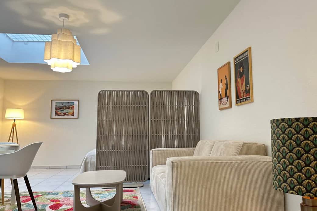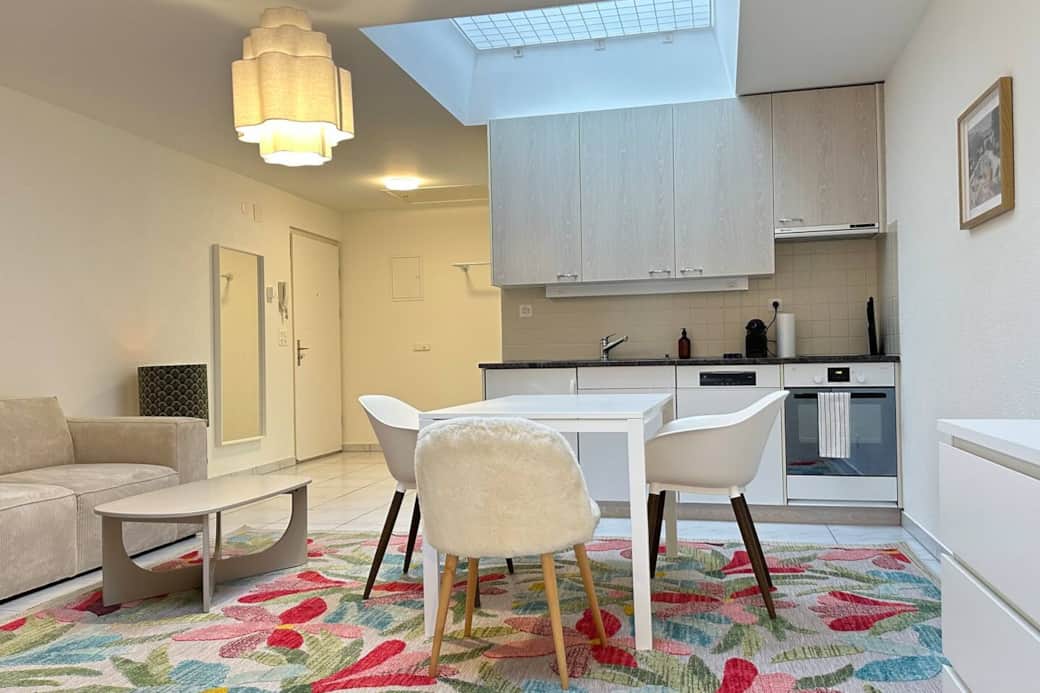 Willkommen in der Cave Suite, einem stilvoll eingerichteten Studio, das Komfort, Ruhe und modernes Design perfekt verbindet. Ein gemütlicher Schlafbereich, ein komfortables Sofa und ein moderner Ess- und Arbeitsplatz sorgen für eine angenehme, ruhige Atmosphäre. Die Küche ist vollständig ausgestattet und hochwertige Details machen den Raum besonders einladend. Ideal für Alleinreisende, Paare und Geschäftsreisende, die eine moderne, gut ausgestattete Unterkunft in Zürich suchen.