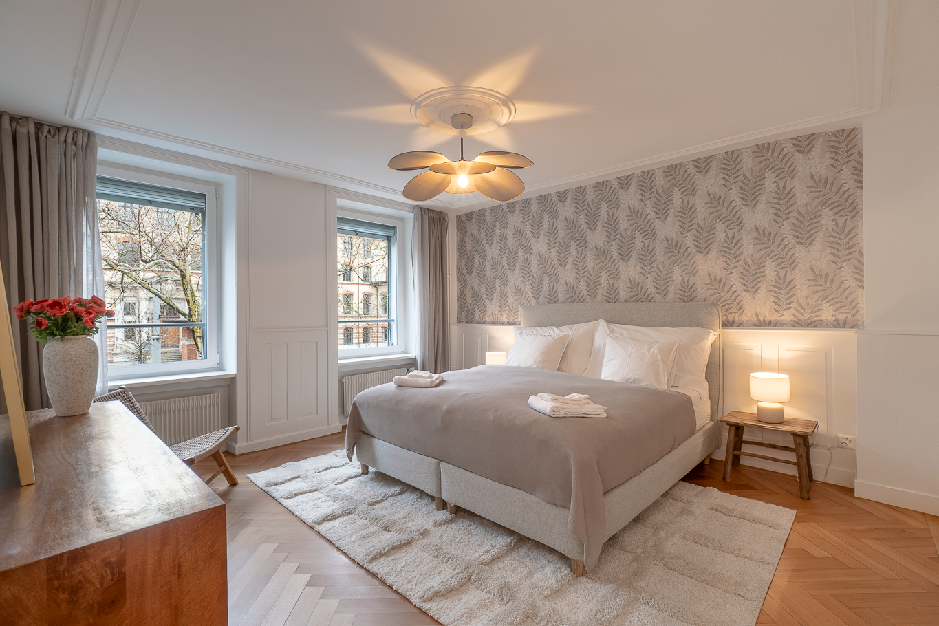 Die Cosy Suite im Herzen von Zürich ist direkt neben der ETH, der Universität und dem Universitätsspital gelegen. Diese großzügige Wohnung im zweiten Stock kombiniert modernen Wohnkomfort mit stilvollen Designelementen, die den Charme des Altbaus unterstreichen. Ein historischer Parkettboden, die hochwertige Ausstattung und die luxuriöse Einrichtung sorgen für ein Wohlfühlambiente. Hier genießen Gäste eine perfekte Mischung aus Eleganz, Komfort und urbanem Flair. Esszimmer: Das stilvolle Esszimmer besticht durch einen großzügigen Holztisch, umgeben von komfortablen Stühlen, die zu geselligen Stunden einladen. Die stimmungsvolle Wandgestaltung und der direkte Zugang zum Balkon verleihen dem Raum eine helle und einladende Atmosphäre, in der Genuss und Geselligkeit harmonisch verschmelzen. Schlafzimmer: Die drei Schlafzimmer vereinen elegantes Design mit natürlicher Wärme. Hochwertige Holzelemente, erlesene Materialien und eine sanfte Farbpalette schaffen eine Oase der Ruhe und Geborgenheit. Bequeme Betten, komfortable Sitzgelegenheiten, sanfte Beleuchtung und liebevoll abgestimmte Dekorationen sorgen für eine Atmosphäre, in der Entspannung und Erholung im Mittelpunkt stehen. Küche: Eine moderne, voll ausgestattete Küche in elegantem Weiß mit schwarzem Boden und Steinplatte, ausgestattet mit hochwertigen V-ZUG-Geräten (Geschirrspüler, Kühlschrank, Backofen, Herd). Zusätzlich steht ein moderner Waschtrockner von Electrolux zur Verfügung. Badezimmer – Modernes Design mit viel Stauraum: Das Badezimmer beeindruckt mit hochwertigen Materialien und einem minimalistischen Design. Balkon: Vom Esszimmer aus betritt man einen charmanten Balkon, der sich ideal für eine kurze Auszeit an der frischen Luft eignet. Charmante Dachterrasse & Exklusive Lage in Zürich: Die Cosy Suite befindet sich an der Universitätsstraße, mitten im gehobenen Kreis 6 – einem der charmantesten und begehrtesten Viertel von Zürich. Ein besonderes Highlight ist die gemeinschaftlich genutzte Dachterrasse, die einen wunderschönen Blick auf den Zürichsee bietet. Perfekt, um den Lage ausklingen zu lassen. Ein Fahrstuhl ist in dem denkmalgeschützten Gebäude leider nicht verfügbar. Perfekte Anbindung: Nur wenige Schritte zur ETH Zürich, der Universität und dem Universitätsspital, ist die Wohnung ideal für Gäste, die privat, geschäftlich oder akademisch in Zürich unterwegs sind. Der Kreis 6 ist bekannt für seine elegante Architektur, ruhige Straßen und eine hohe Lebensqualität. Umgeben von charmanten Cafés, kleinen Boutiquen und Restaurants sind es zur Innenstadt nur wenige Gehminuten. Darüber hinaus verfügt die Wohnung über eine hervorragender Anbindung an den öffentlichen Nahverkehr. Gemeinsame Dachterasse Per Telefon, Email oder Messenger.